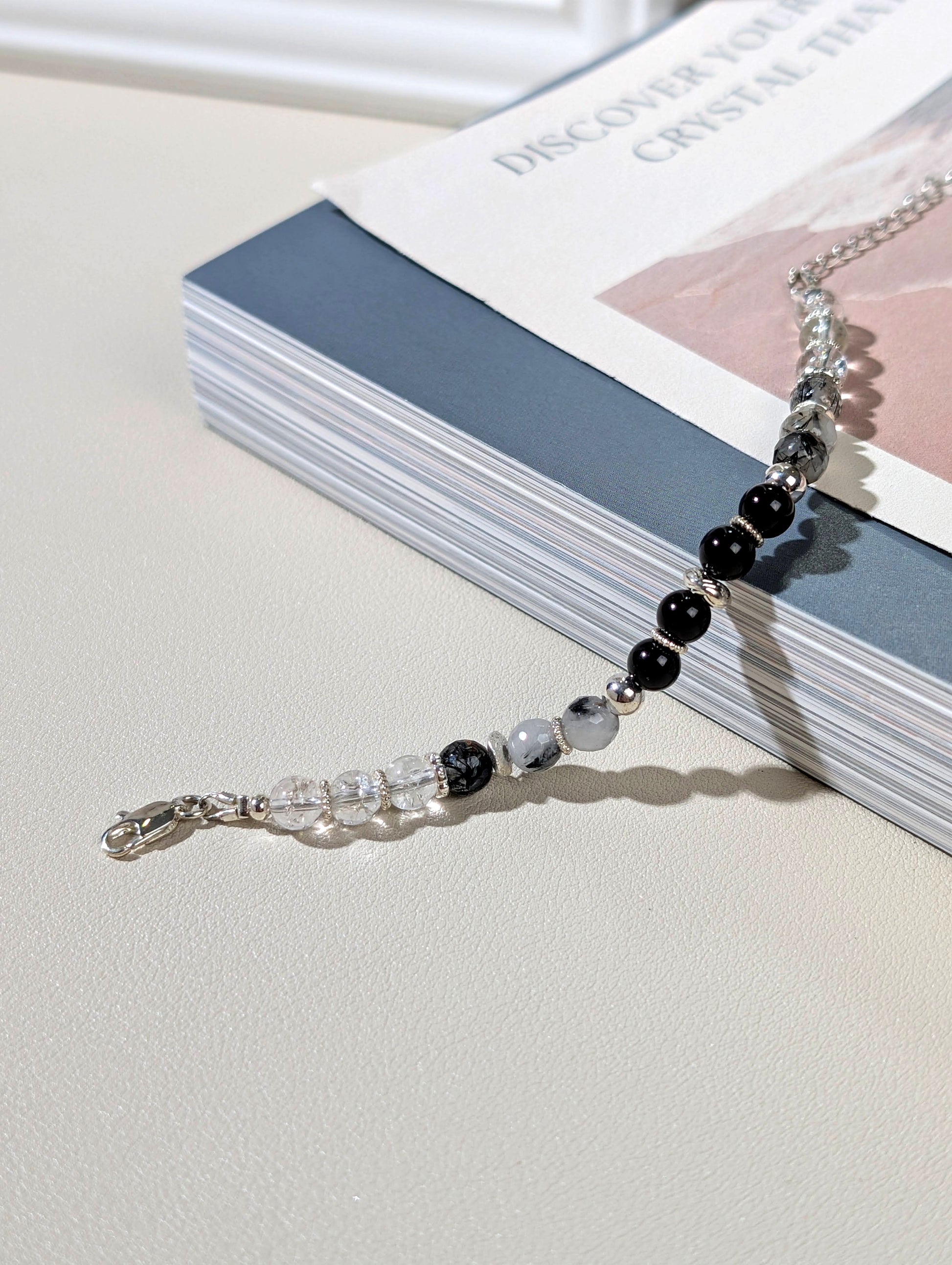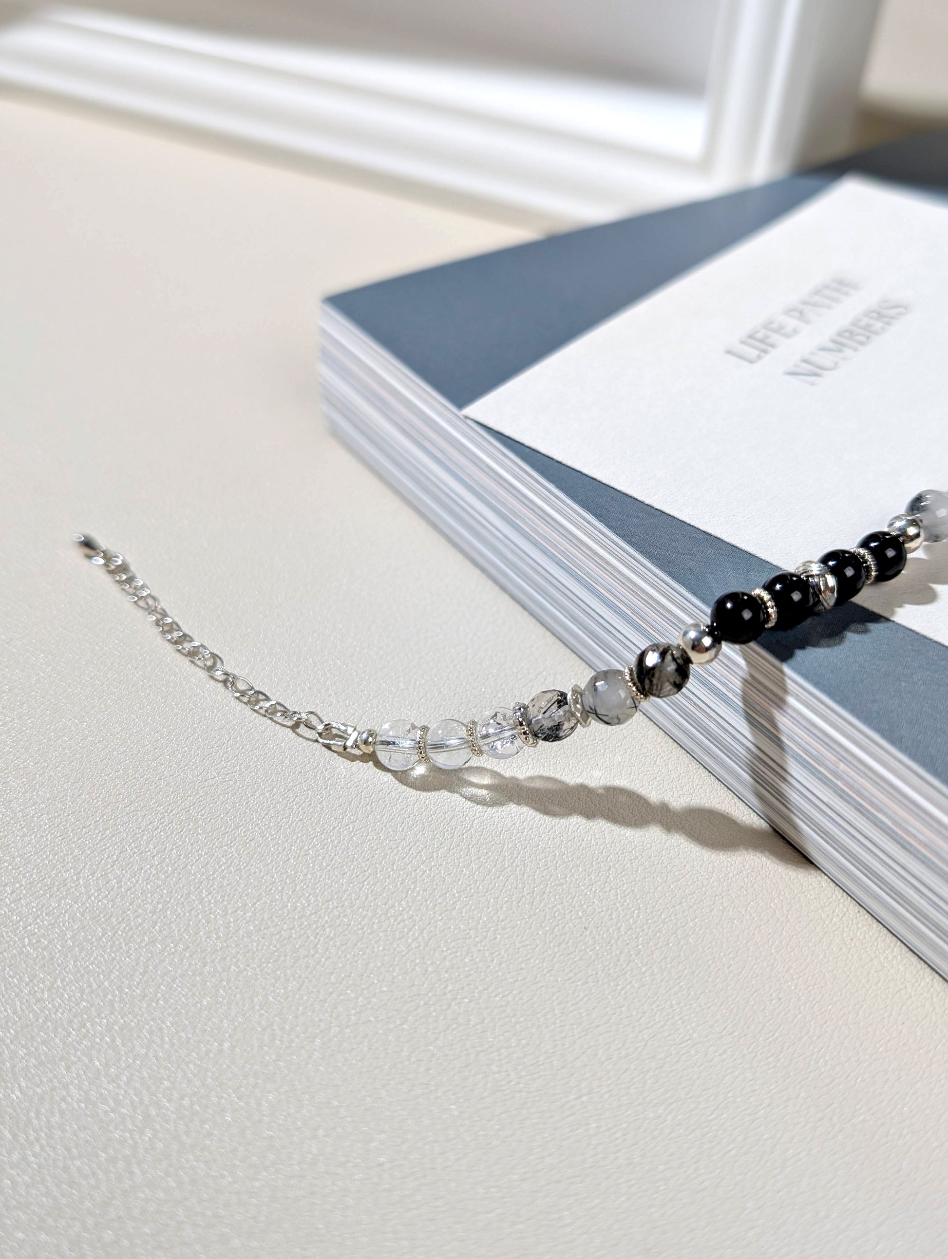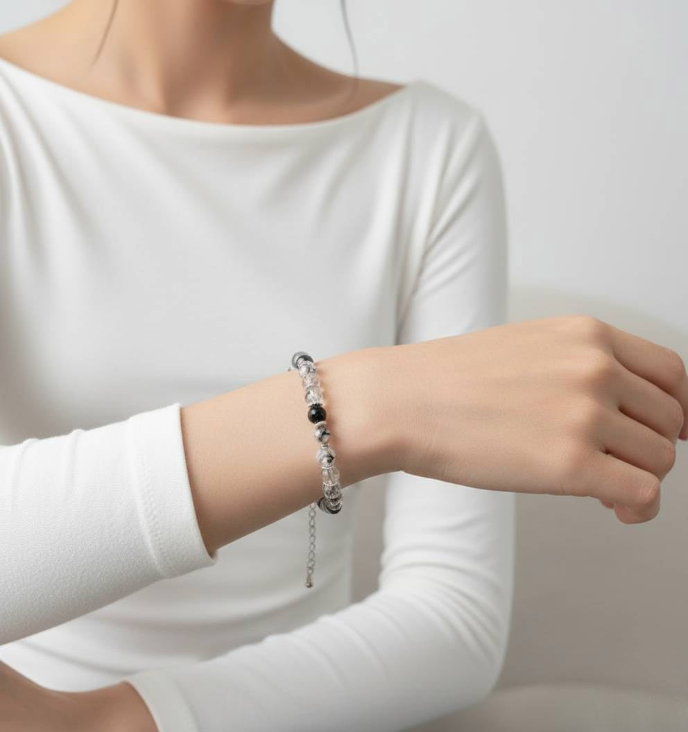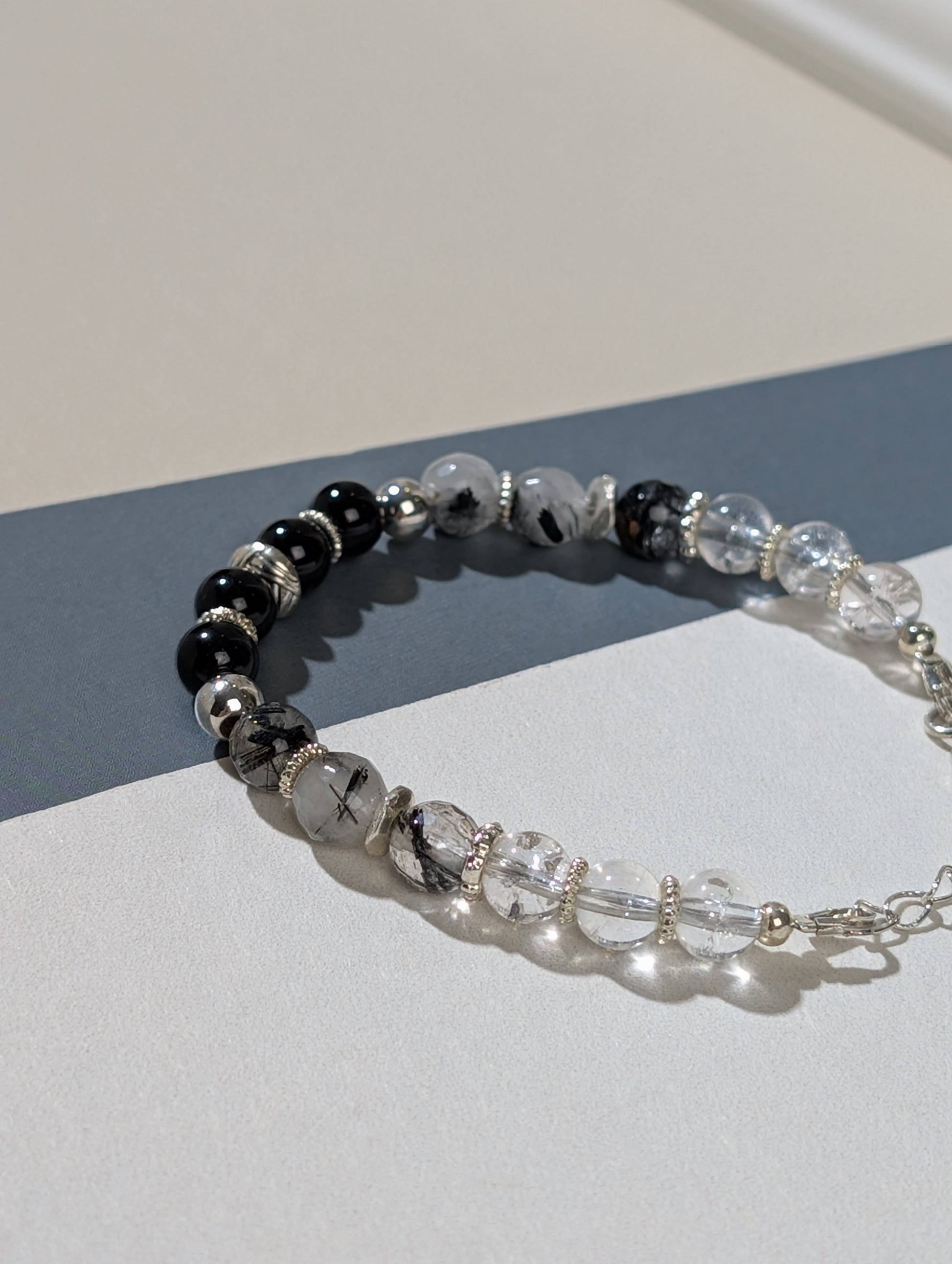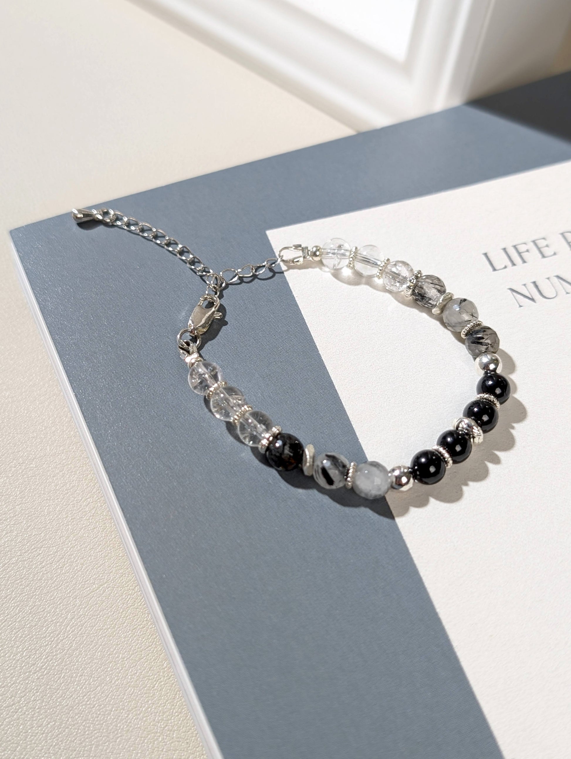 如破曉前的天際,墨色與晨光在手腕間交織,黑髮晶的深邃漸漸融入白水晶的清透。