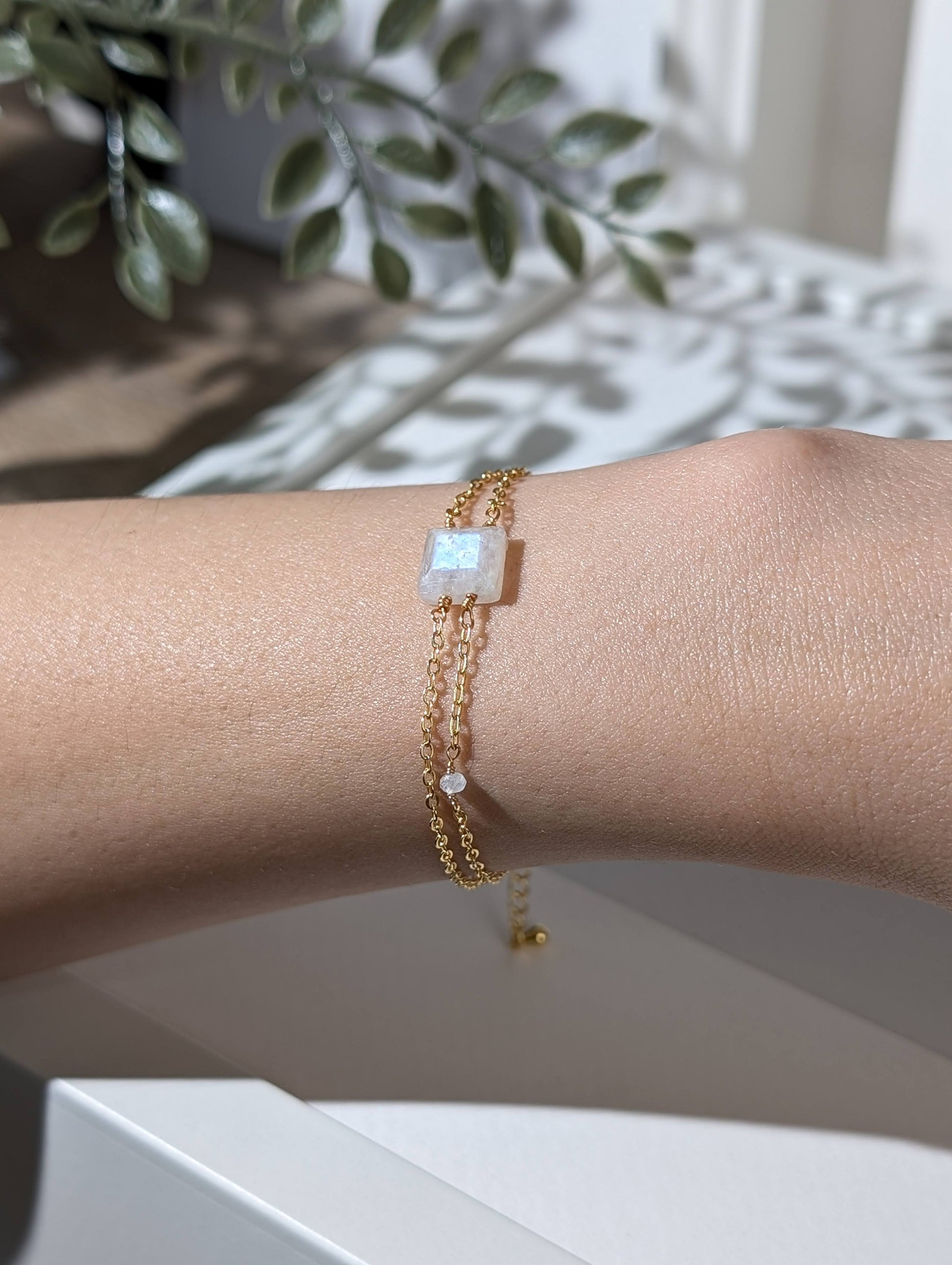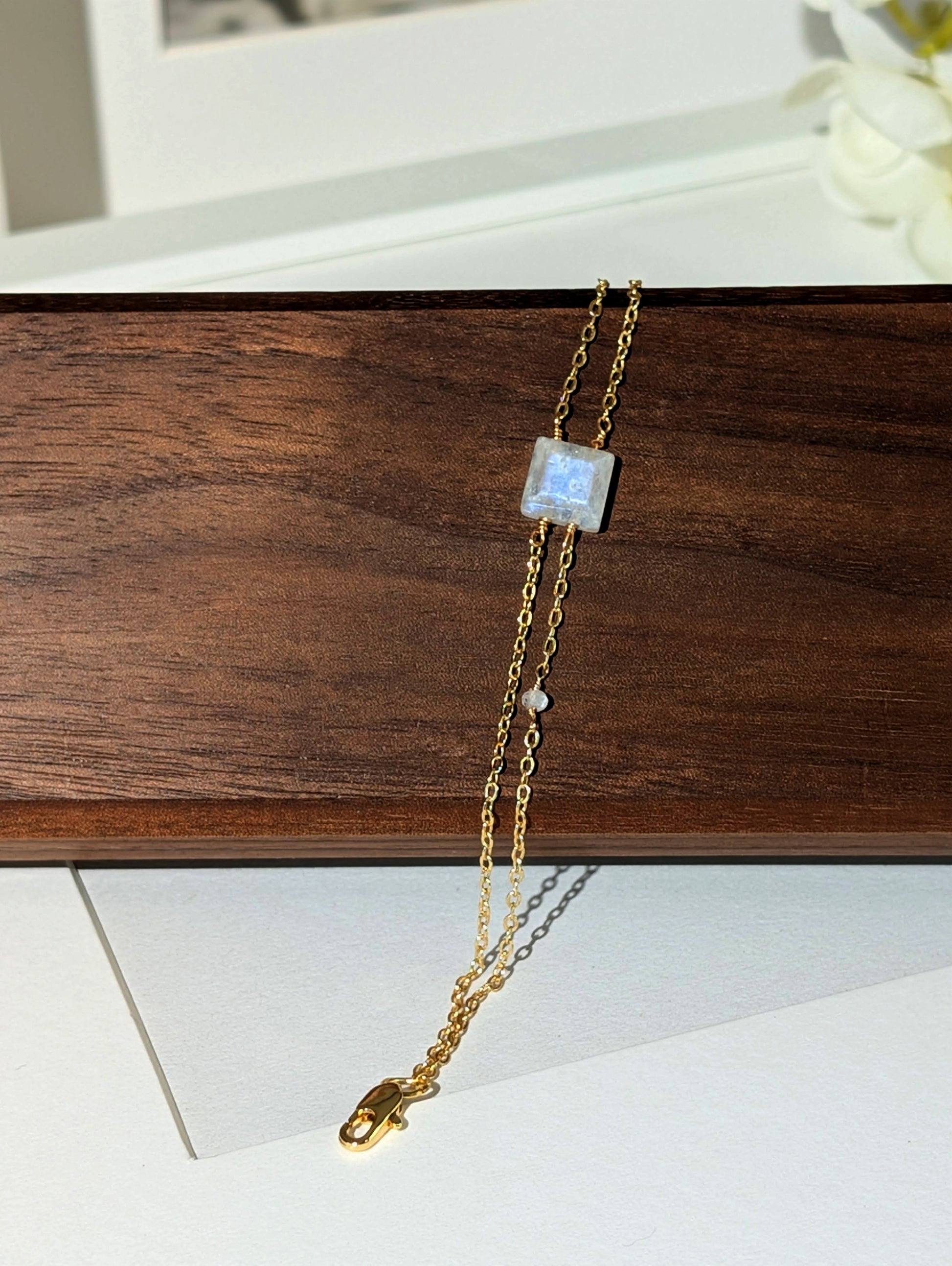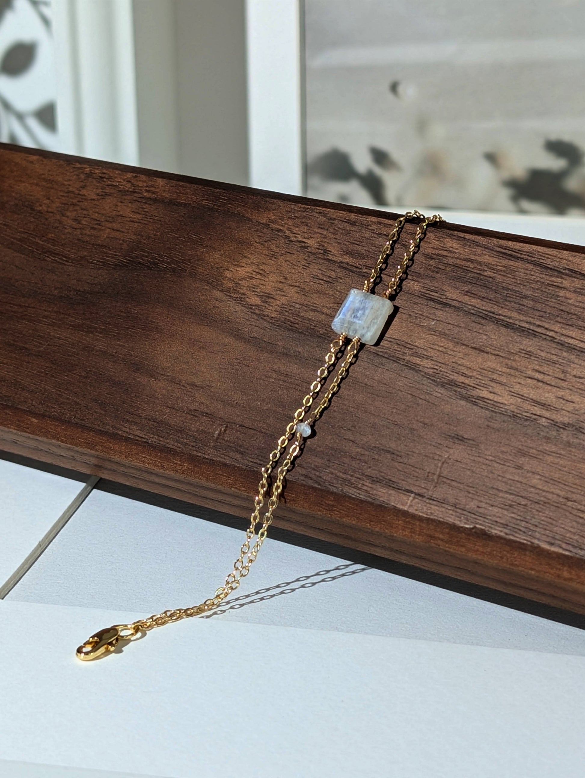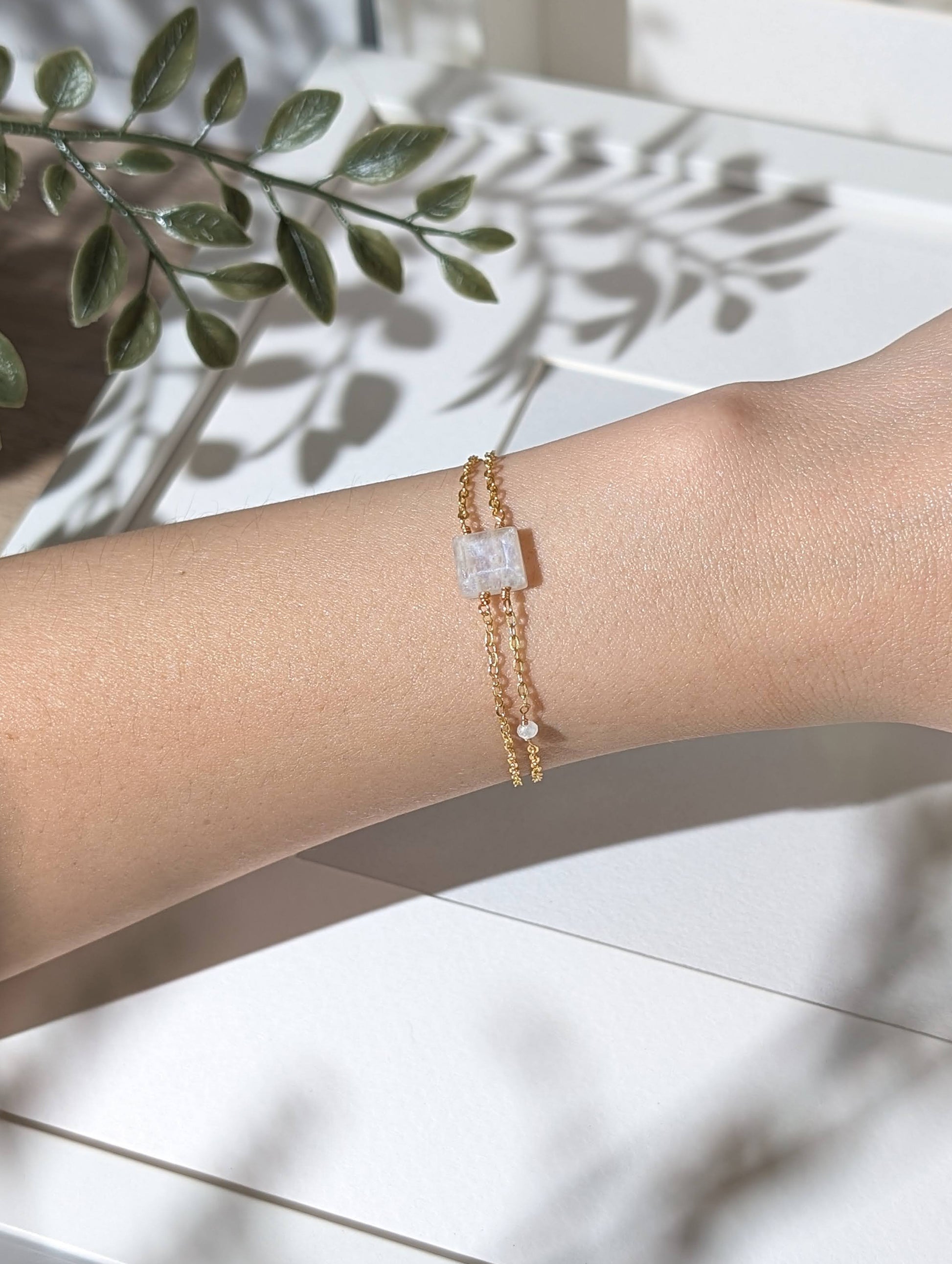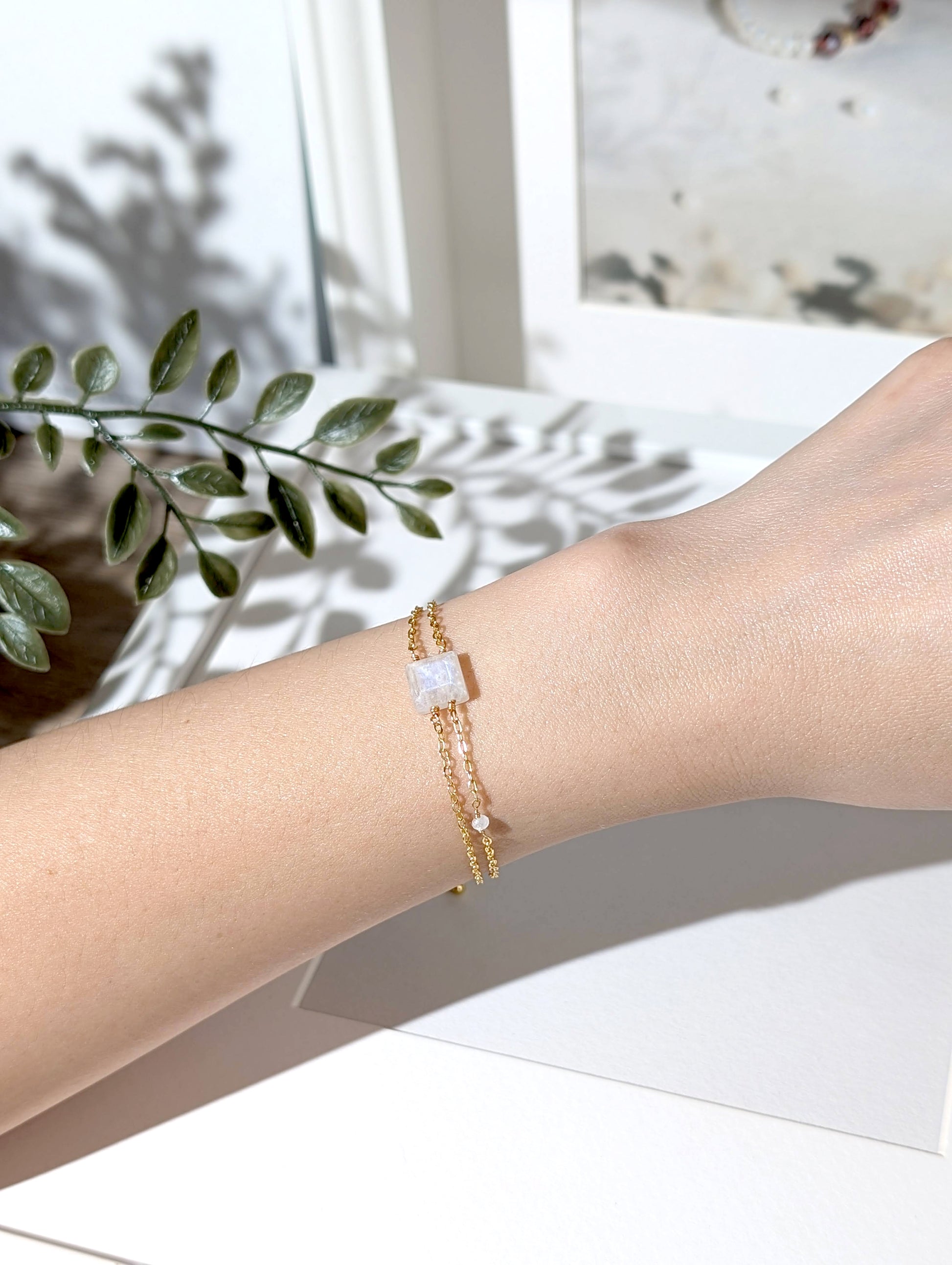 雙鍊設計,金色線條細膩相疊,溫柔卻不失堅韌,映照著月光石的靈動之美;搭配銅鍍 18K 金金屬配件,耐用又不失奢華。配戴尺寸 15cm,附約4cm 延長鏈,可依手腕自由調整,佩戴舒適穩固。