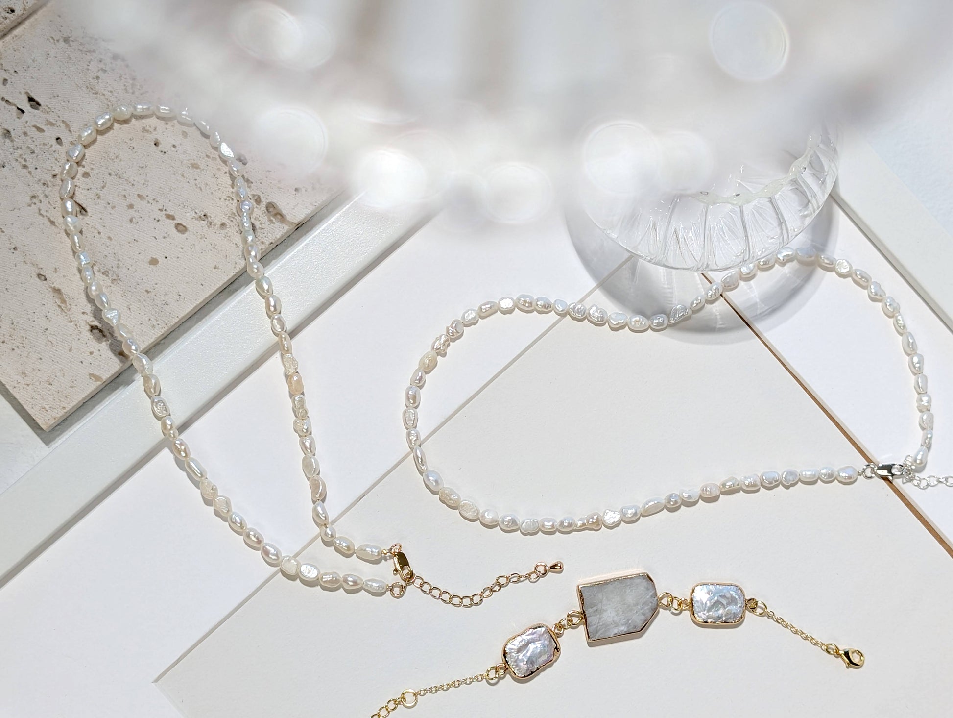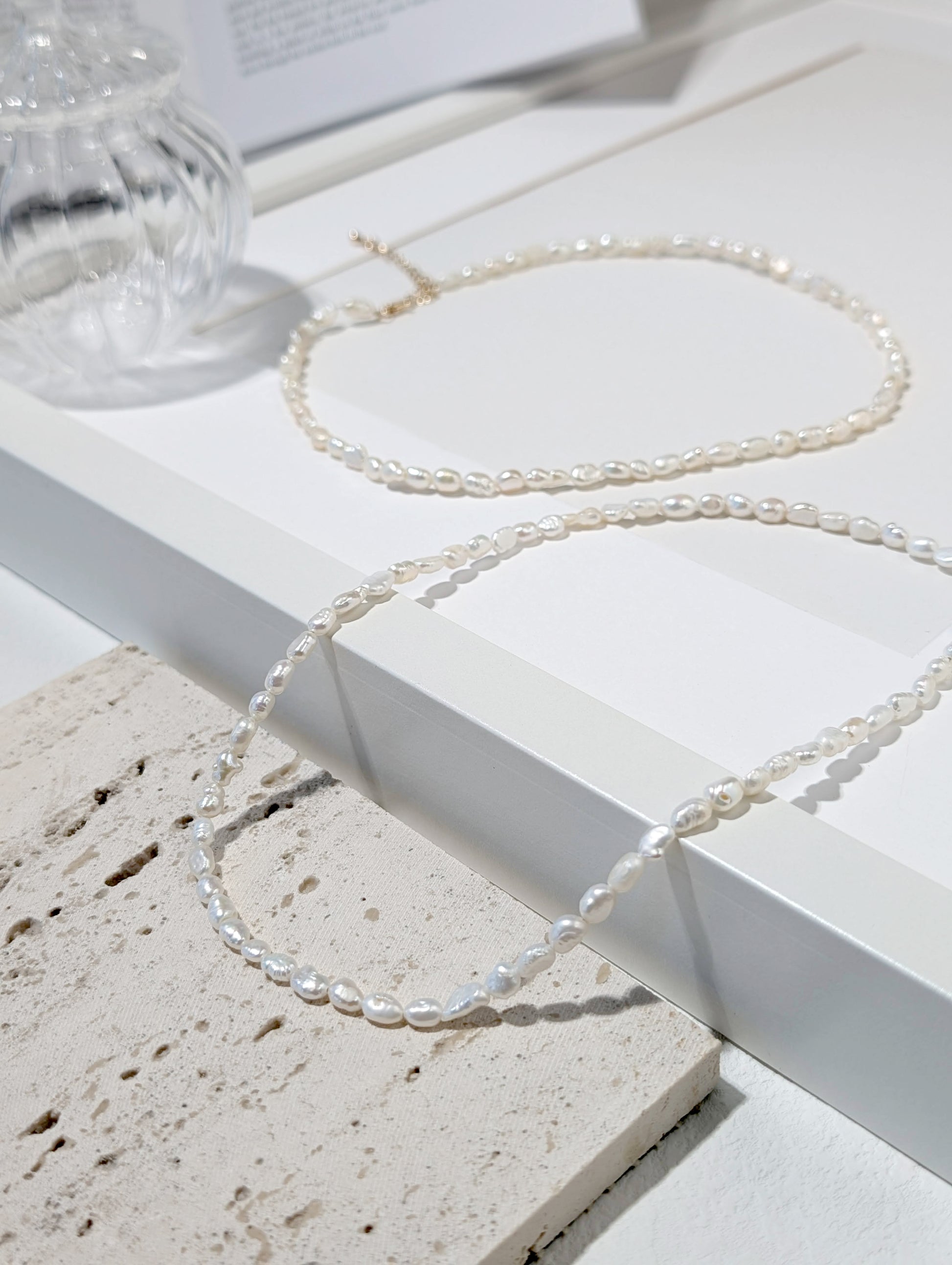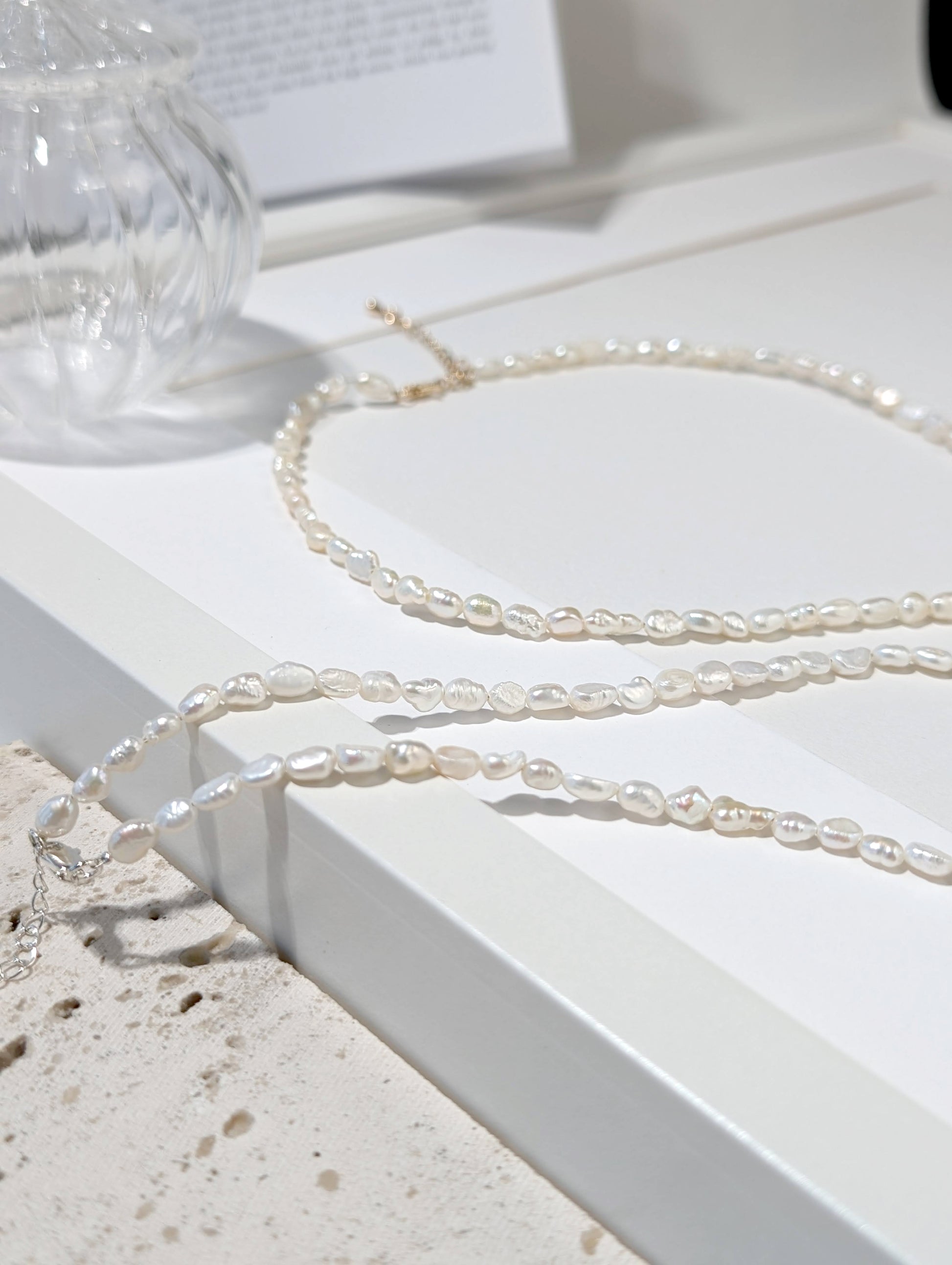 不規則的珍珠,如水面泛起的微漣,映照著月光的柔和光暈。承載著自然的律動與純粹的優雅,在頸間輕聲流轉,如同月色下的海之歌。